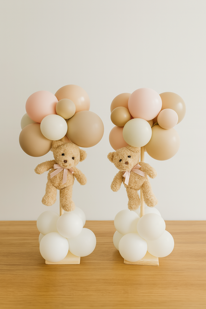 Onze Tafelstuk Met De Beer is een unieke en compleet afgewerkte creatie, perfect voor babyshowers, verjaardagen of doopfeestjes.