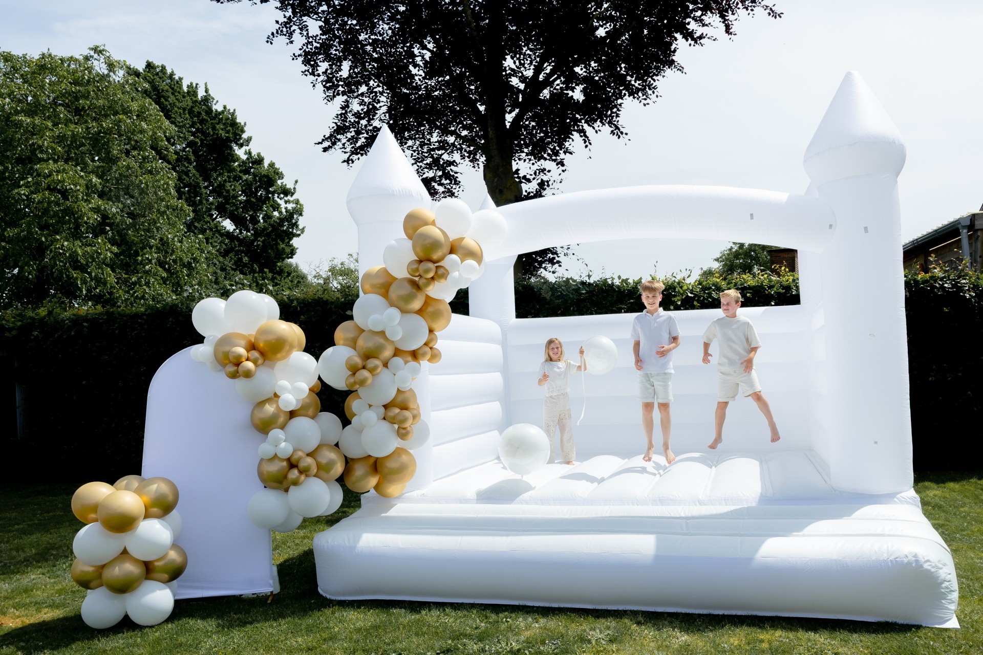 Combineer het met onze ballondecoratie en voeg desgewenst personalisatie toe voor een unieke beleving. Maak jouw dag onvergetelijk met Ivory Bloom springkussen verhuur.