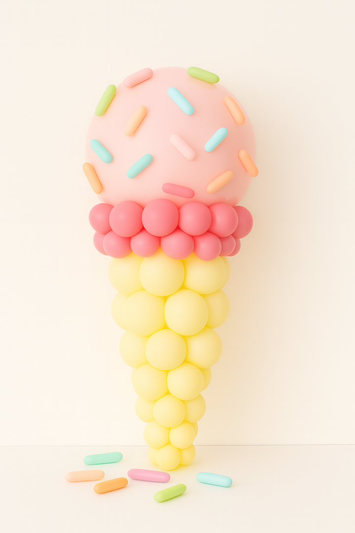 Verwen je kleine gasten met een zoete verrassing! Deze speelse en kleurrijke ijs ballonnenzuil is een echte blikvanger die meteen een vrolijke sfeer toevoegt aan jouw feest. Met pastelkleurige sprinkles en een schattig hoorntje past hij perfect bij een ballon backdrop met snoep- of donutthema.