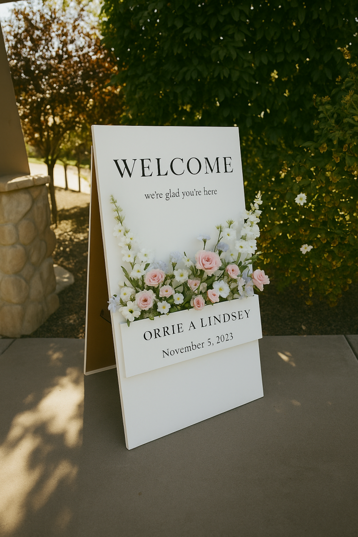 Verwelkom je gasten in stijl met dit elegante welkomstbord, afgewerkt met een verfijnd bloemstuk. Perfect voor bruiloften, doopfeesten, verjaardagen of andere bijzondere gelegenheden.